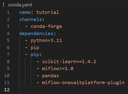 - conda.yaml: hay que modificar el Python a 3.11 y hay que añadir el paquete de mlflow de la Plataforma (mlflow-onesaitplatform-plugin):