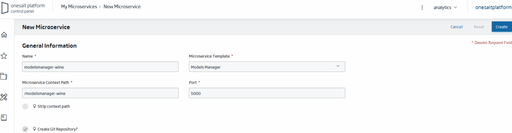 Se abrirá entonces el asistente de creación de microservicios. Se escogerá en «Microservice Template» la opción de «Models Manager». De esta forma, la Plataforma realiza un clonado de un repositorio base (microservice-modelsmanager), con el que se crea una predicción genérica.