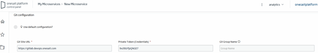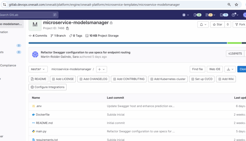 - Repositorio de Git: se genera un repositorio de Git con la plantilla base que se ha seleccionado. Al pulsar en el enlace de «Git URL» desde el listado de microservicios, se redirige y se puede ver el repositorio creado con el nombre que se ha puesto.