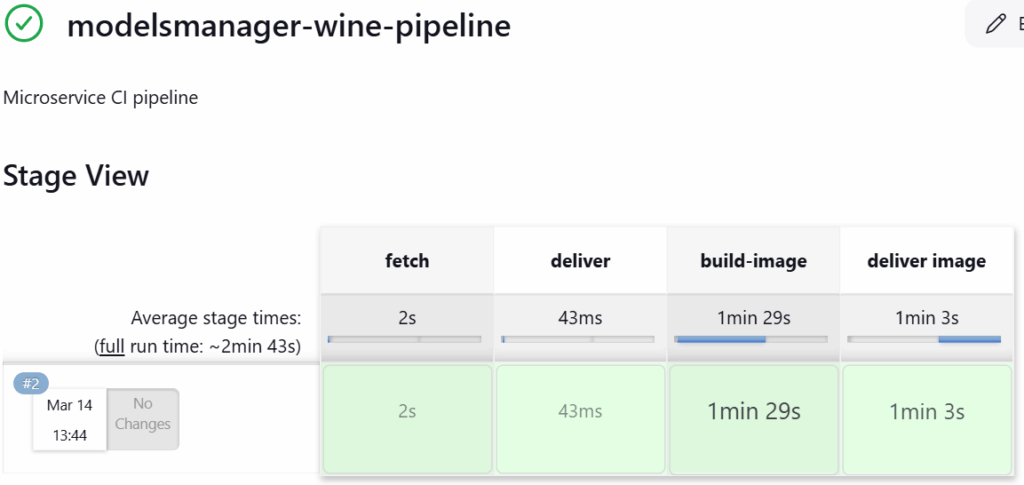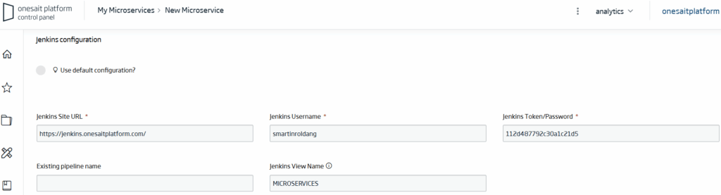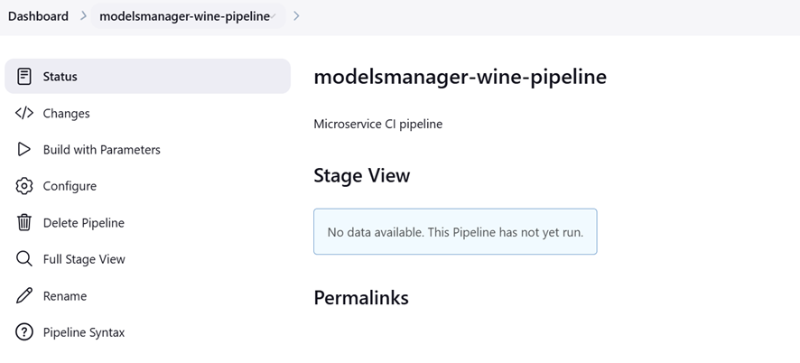 - Pipeline en Jenkins: se genera un pipeline en Jenkins llamado name-pipeline (donde «name» es el nombre indicado). Se podrá acceder al pipeline rápidamente al pulsar en el enlace de «Jenkins URL» desde el listado de los microservicios, lo que redirige y permite ver el pipeline creado con el nombre mencionado.