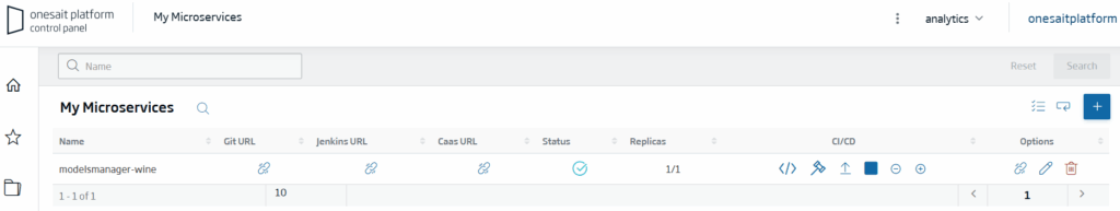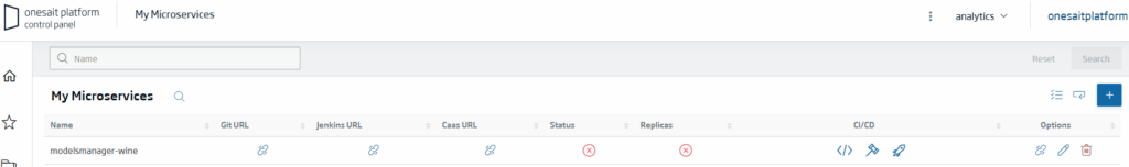 Se mostrará entonces el listado de microservicios disponibles al usuario. Para crear un nuevo microservicio, se pulsará en el botón de «+» situado en la parte superior derecho.