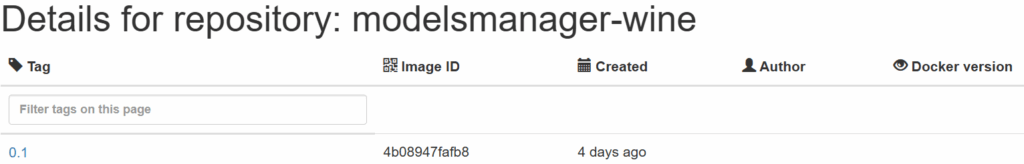 Una vez se selecciona en «Microservice Template» la opción de «Models Manager», aparece una opción de «Experiments», donde aparece los experimentos, y cuando se selecciona el que se desea aparece una tabla con los modelos, donde se va a poder seleccionar el modelo con el que se desea trabajar. En este caso, se seleccionará el que se ha creado anteriormente.