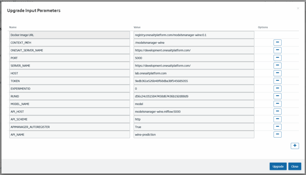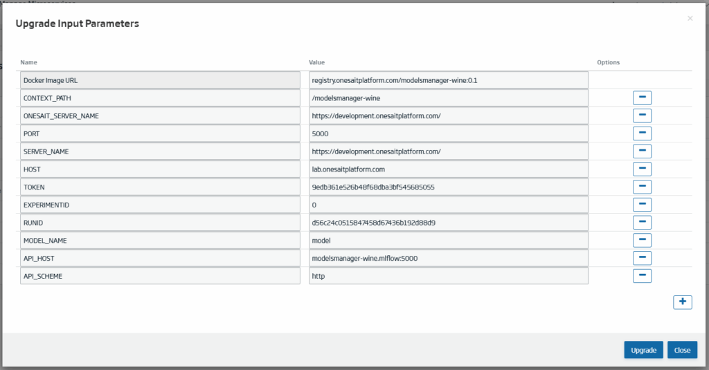 Si se quiere, es posible añadir o modificar los parámetros del microservicio. Al hacer clic en el CI/CD, en «Upgrade» (la flecha hacia arriba), se abre una pantalla en la que se puede añadir nuevos parámetros con el «+» o eliminar parámetros con el «-». Habrá que añadir obligatoriamente el HOST, TOKEN, EXPERIMENTID, RUNID, MODEL_NAME, estos no hacen falta obligatoriamente: API_HOST y API_SCHEME. Después de realizar los cambios en los parámetros, simplemente se pulsa en el botón de «Upgrade» y el microservicio se actualiza.