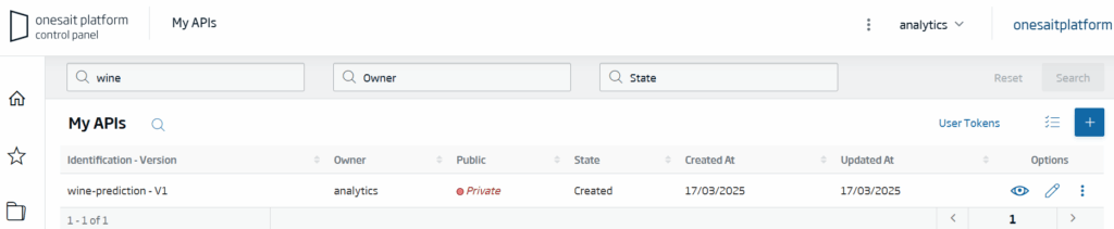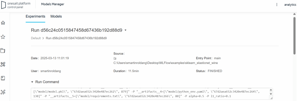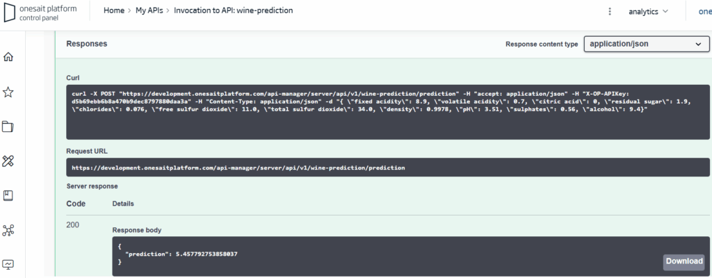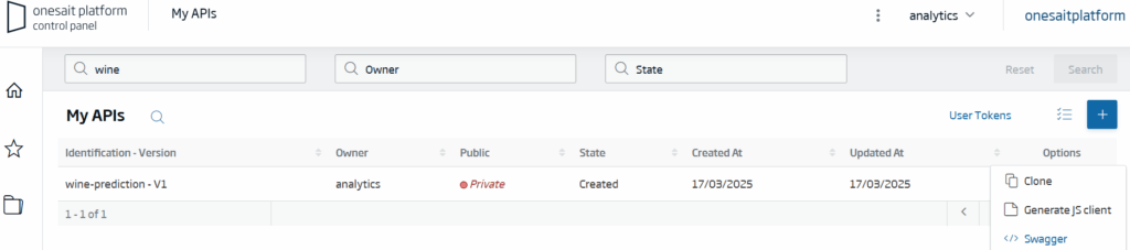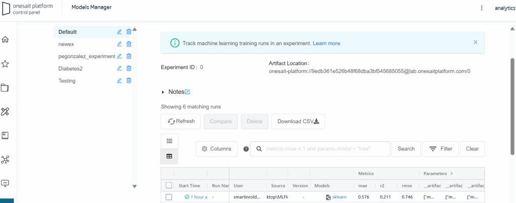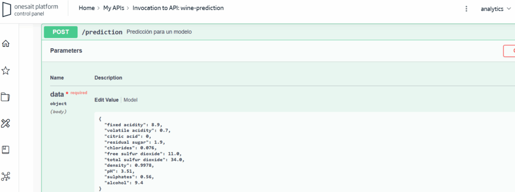 Además, con el uso de la herramienta del Models Manager (encargada del MLOps en Onesait Platform) se va a poder controlar los diferentes experimentos que se hacen previamente, evaluar resultados, compararlos, etc., creando finalmente un modelo óptimo de predicción de vino que va a permitir determinar la calidad del vino a partir de ciertos datos que se proporcionen.