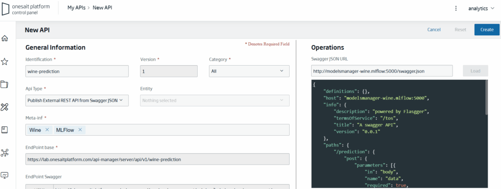 Finalmente, a través de la Plataforma en el gestor de APIs, se va generar el API, lo que va a permitir definirla y gestionarla. Se va a poder acceder a la interfaz de Swagger y comprobar el funcionamiento del modelo predictivo directamente desde la Plataforma. Al hacerlo de esta manera, se aprovecha la seguridad que ofrece la Plataforma.