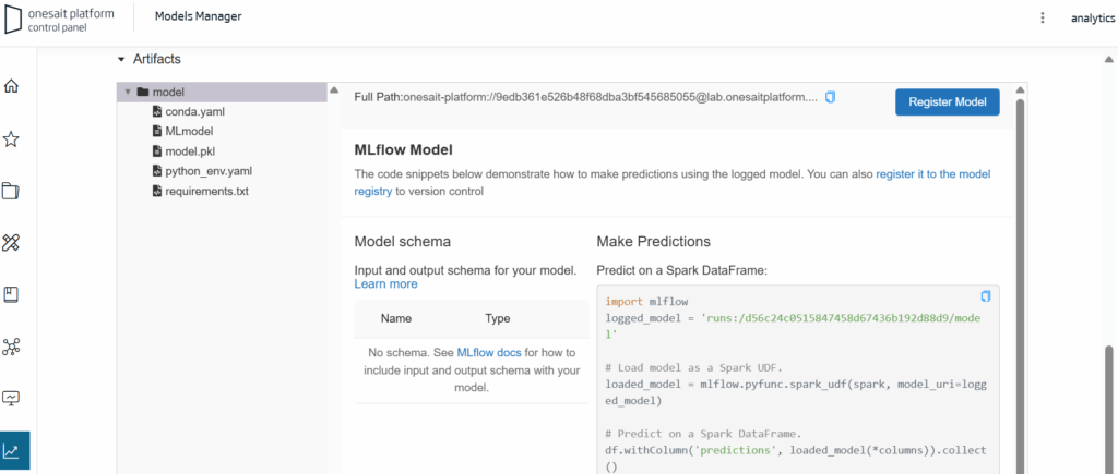 Este modelo de predicción se registrará en la herramienta de Models Manager, lo cual va a permitir su gobierno, así como acceder al mismo en fases posteriores para poder desplegarlo.