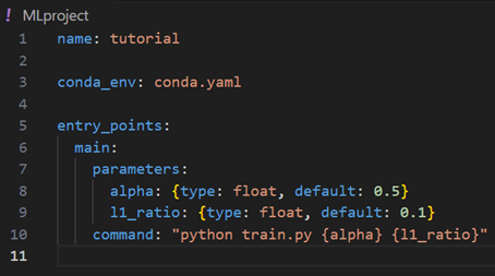 - MLproject: hay que modificar la línea 3 a «conda_env: conda.yaml»: