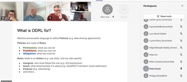 El seminario continuó con una presentación sobre la herramienta de políticas de UPCAST, que utiliza el Lenguaje de Derechos Digitales Abiertos (ODRL) para definir políticas de intercambio de datos, incluyendo permisos, prohibiciones, obligaciones y restricciones. También se demostró el complemento de negociación de contratos de UPCAST, que facilita la distinción clara de roles entre consumidores y proveedores, simplificando el proceso de negociación.