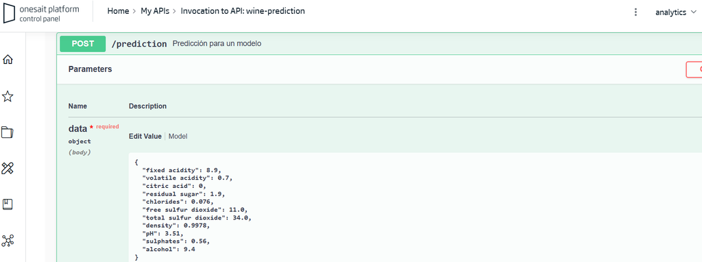 Finally, the API is generated from the Platform, which allows us to define and manage it. We can access the Swagger interface and make use of the predictive model from the Platform, and thus take advantage of the security offered by the Platform.
