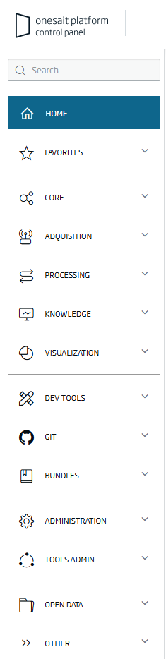 Therefore, since version 7.0.0 of Onesait Platform, the menu bar for accessing the modules has been reorganised to show this thematic organisation: